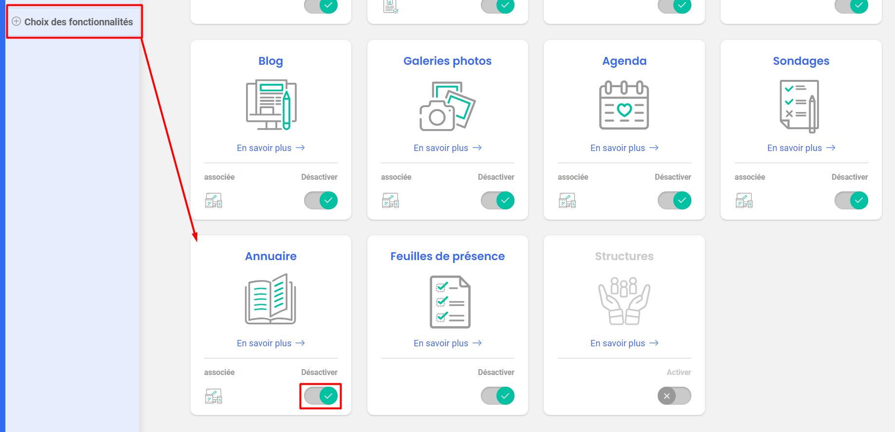 Assurez-vous de bien avoir activé l’annuaire dans la liste des fonctionnalités. Pour cela, rendez-vous dans Paramètres > Choix des fonctionnalités et cliquez sur le bouton Activer.