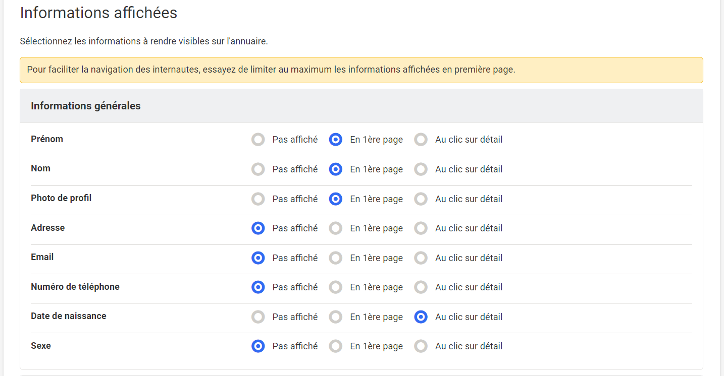 Seuls sont proposés les champs visibles par l’inscrit lui-même. Les champs visibles uniquement par les administrateurs n'apparaissent pas parmi les informations qu'il est possible d'afficher dans la page d’annuaire.