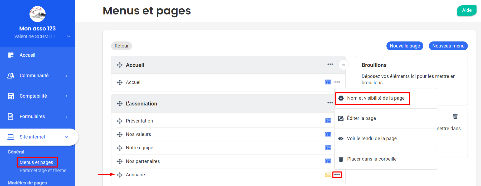 Déplacez votre page des brouillons vers le bloc central, sous le menu de votre choix, pour la publier.