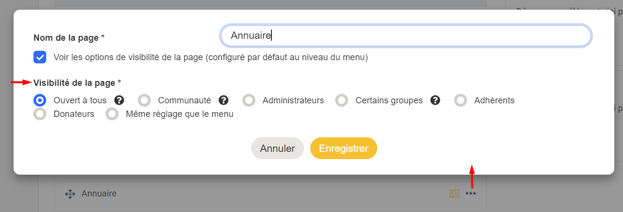 Une fenêtre s'ouvre, vous permettant de définir à qui vous souhaitez afficher cette page, et modifier le nom si besoin. Si vous choisissez une autre option que "Ouvert à tous", seules les personnes enregistrées dans votre Communauté, connectées et membres du groupe choisi pourront accéder à votre page.