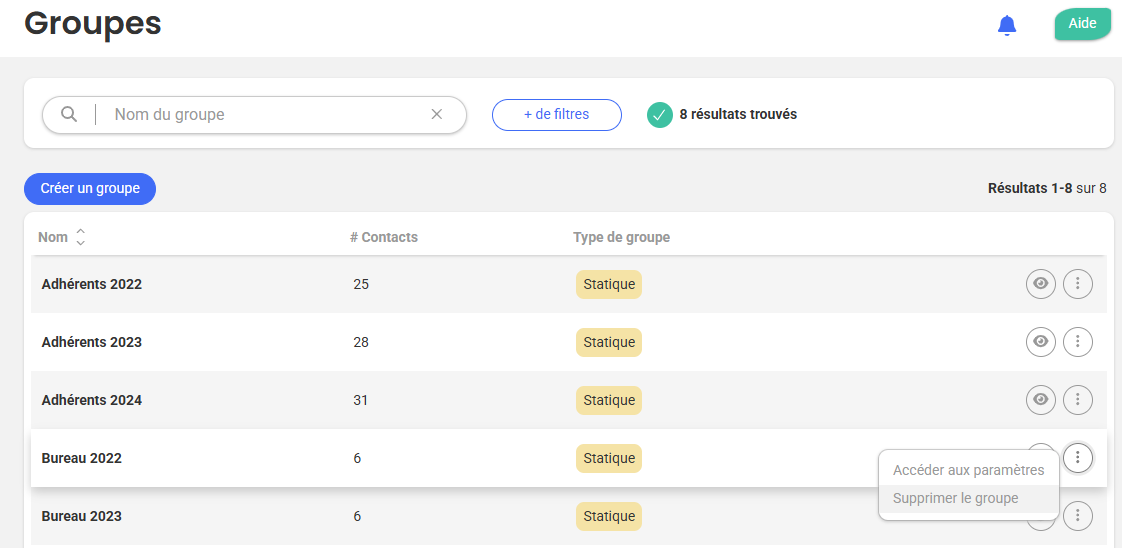 Dans le cas où vous souhaiteriez supprimer un ou plusieurs groupe(s), rendez-vous sur la page Communauté > Groupes puis cliquer sur le bouton "..." en face du groupe en question.