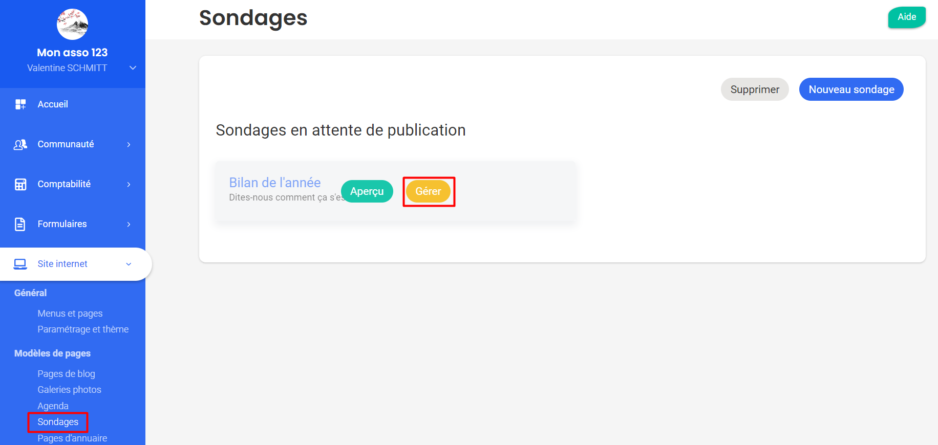 - Passez votre souris sur le sondage concerné, cliquez sur le bouton "Gérer" qui apparaît ;