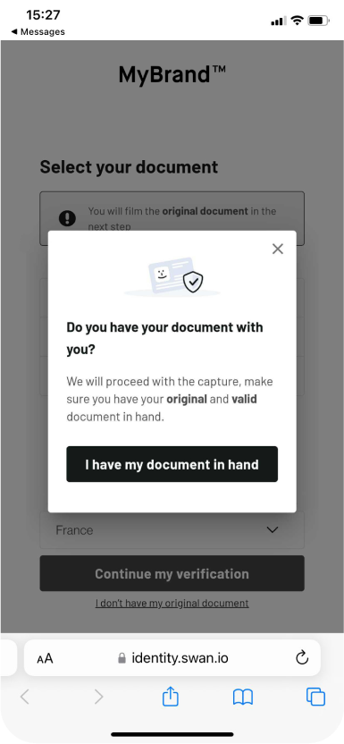 Pour commencer la vérification d'identité, cliquer sur 'Vérifier mon identité'.