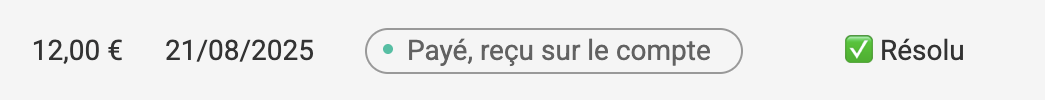 Dans l’interface admin, le paiement est identifié par une icône de signalement.