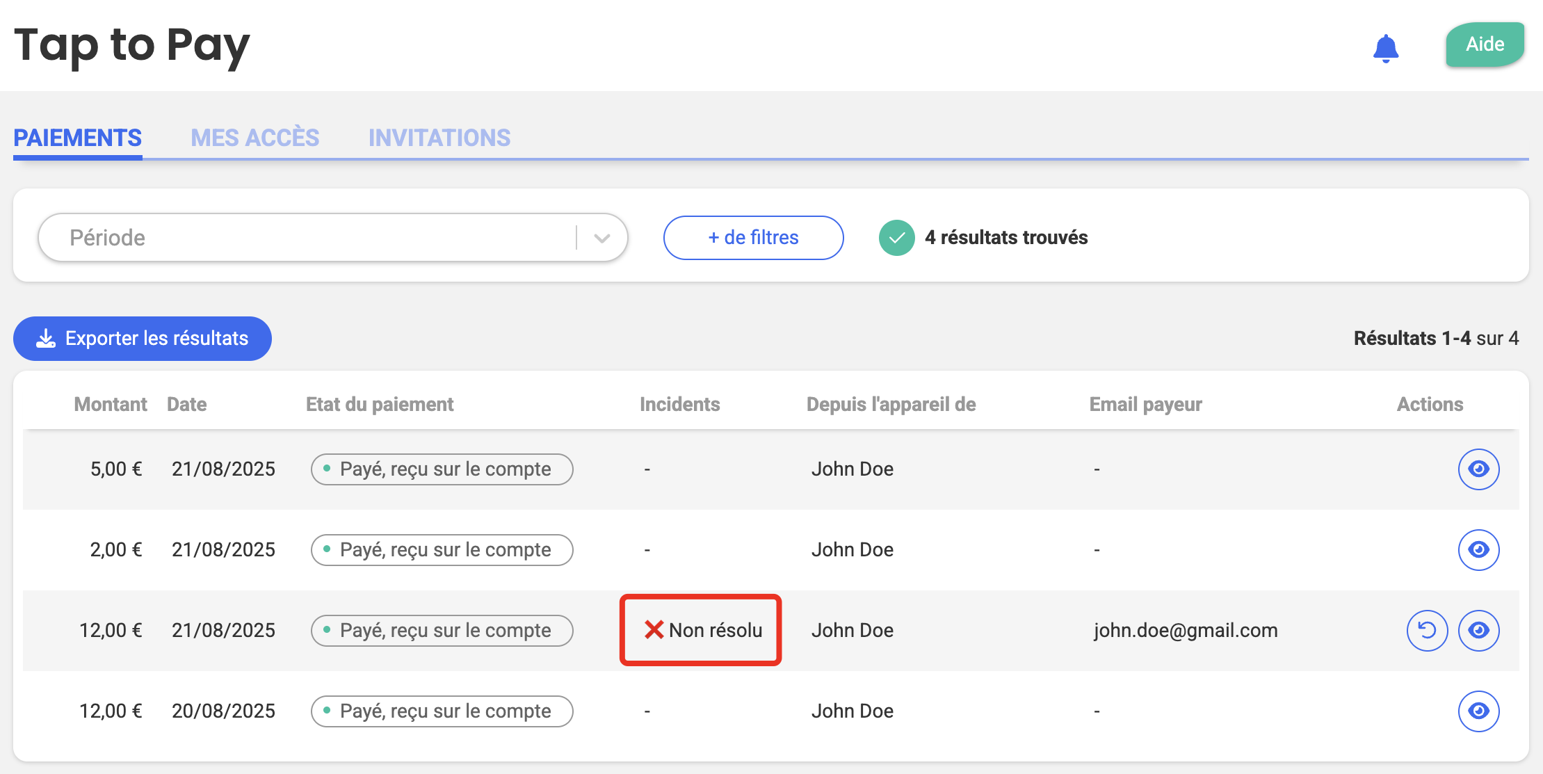 Oui, dans Tap to Pay > Paiements, un filtre permet de trier les paiements selon leur statut d’incident :