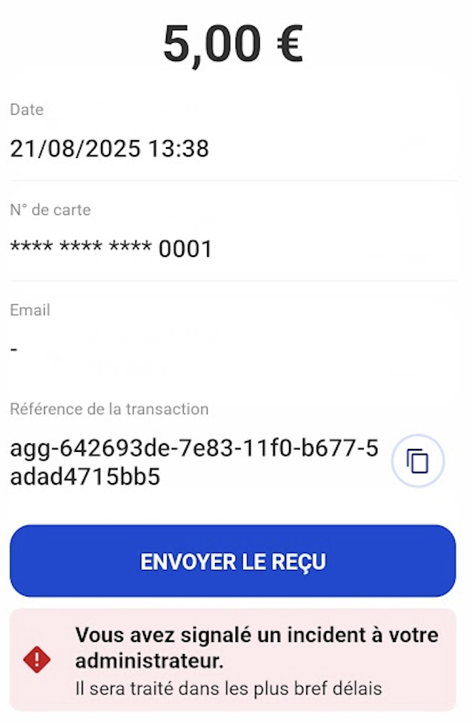 Cette fonctionnalité permet aux bénévoles et administrateurs de signaler un incident sur un paiement effectué via Tap to Pay. Le signalement déclenche une alerte pour les administrateurs principaux, qui peuvent ensuite consulter les détails dans l’interface d’administration et décider des actions à mener (remboursement, suivi, etc.).