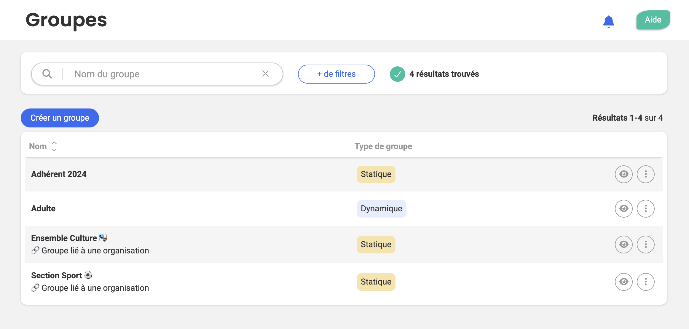 Les groupes simples sont désormais appelés des groupes. Leur fonction première est la segmentation de votre base de contacts pour vos actions de communication et de gestion (CRM).