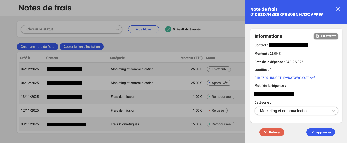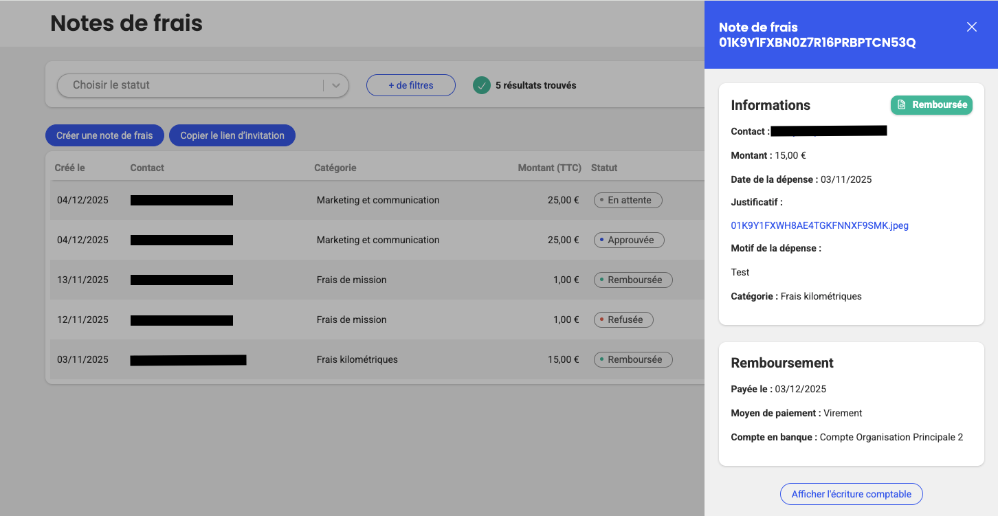 - Une confirmation s'affiche : "La note de frais a été remboursée. Un email a été envoyé à votre contact pour l'informer."