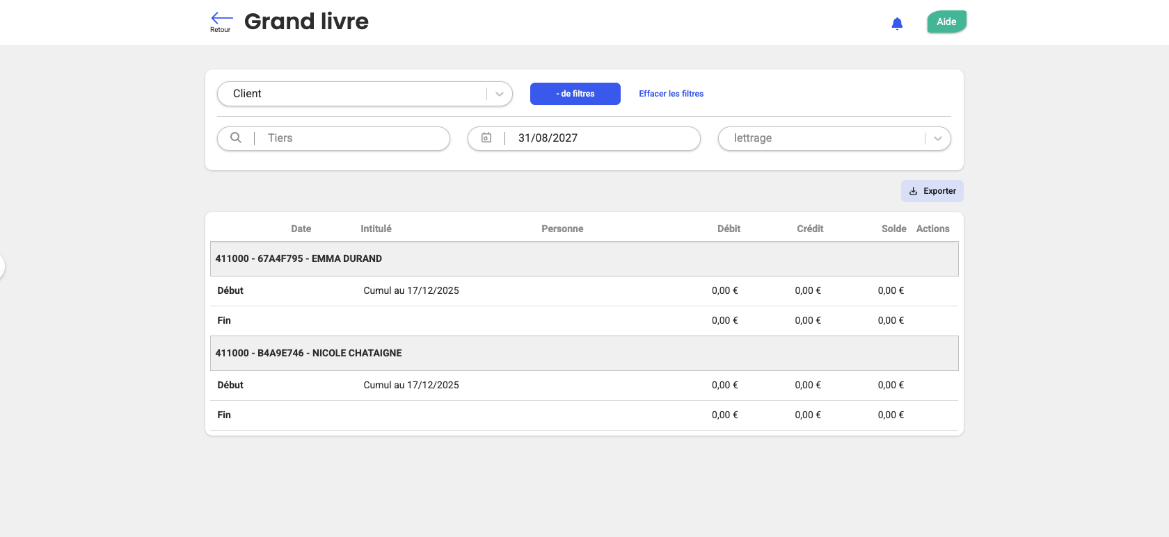 Sélectionnez le Grand Livre Client, Fournisseur ou Contact pour filtrer les écritures selon leur lettrage.